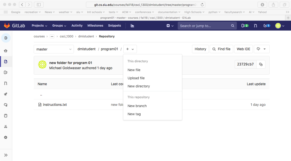 For this course, we will rely on only the most basic features of git (and will save more advanced features for later courses). We will also be relying primarily on a web-based interface known as gitlab which allows you to browse, create, and edit files from your browser. You should be able to rely on this web-based interface throughout the semester (although we are happy to explain how to install and use git as a more advanced command-line tool for those interested.)