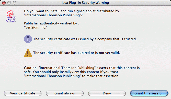 Once you are viewing the main page for the textbook's software, you will find their labs organized by chapter. You can select the lab you wish to run. For many of the labs, when you run the software for the very first time, a window will pop up labeled with a title such as "Security Warning" and it will ask you whether or not you wish to "trust" the software. When asked, please grant your permission; we will explain why in the next section.