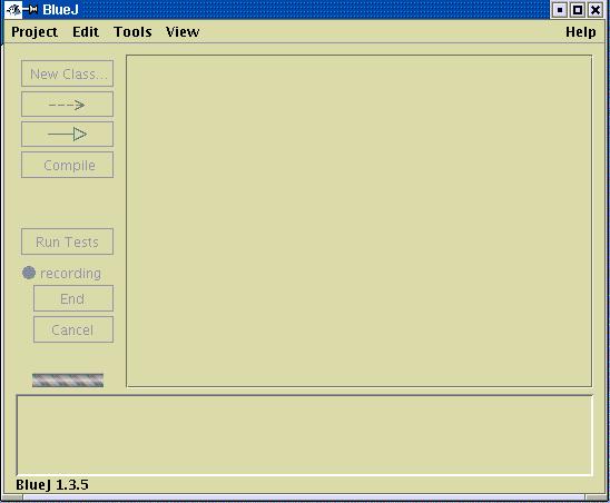 To facilitate our development of programs in Java, we will be using an integrated Java environment known as BlueJ. On patel2 you can start this program by going to the "K" menu at bottom left, then selecting the "Java" folder, then selecting the "BlueJ" entry. (KDE also adds your most recently used applications to the very top of the "K" menu, so the next time you try it you will also find a listing for BlueJ there). If you have successfully started up BlueJ, you should get a window such as this: