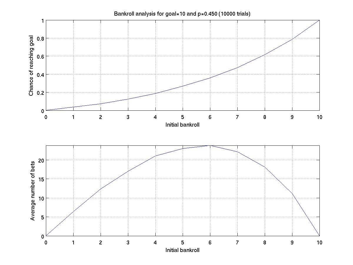 Consider the following simulation. A gambler starts with an initial bankroll (e.g., $50) and a target goal (e.g., $100). He or she then makes a series of $1 bets (winning each with independent probability 0 ≤ p ≤ 1 until reaching the goal or going broke.