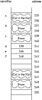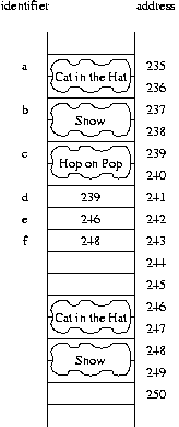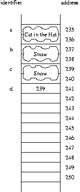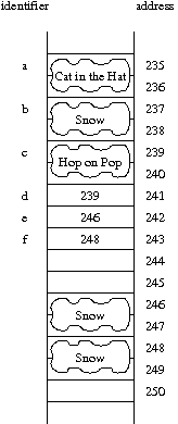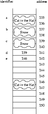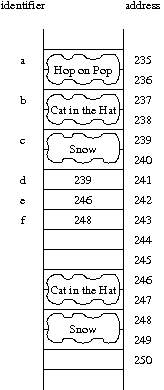 is changing the state of the object at address 239. Therefore, this has the apparent effect of changing c, *d and *e, all of which refer to the same object. The resulting picture is portrayed asd->setBook("Hop on Pop");