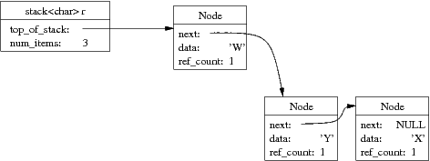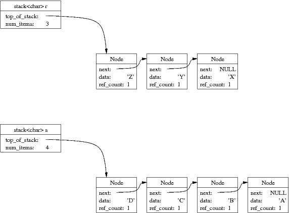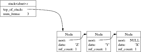 For accounting purposes, the code we provide manages an additional variable stack::total that counts the overall number of nodes in the system. Please do not confuse this variable with the above mentioned reference counting. The total variable is a single static variable, meaning that it is not part of an individual node's state but instead shared globally throughout the program. In order to keep an accurate count of the number of nodes, we execute total++ inside the Node class constructor and total-- within the Node class destructor. Although you are welcome to make changes to those routines, please do not alter our management of the total variable.