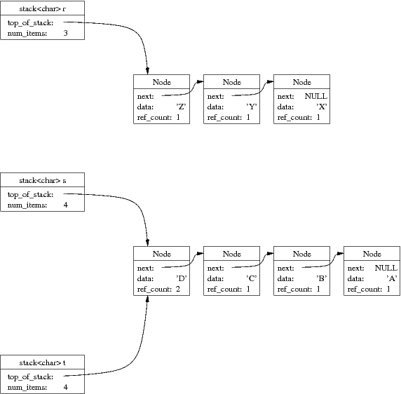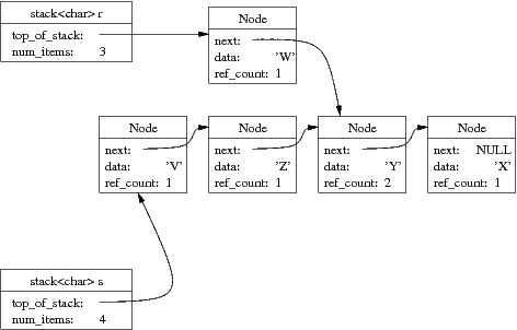 One remedy for this problem is simply to get rid of the command delete old_top. With that change, our public abstraction of a stack is valid. Even though we have used a shallow copy, we can subsequently manipulate both stacks independently without undesired side effects. The problem with this remedy is that our program has a huge memory leak, as nodes are created but never destroyed. In the next section, we describe a strategy for avoiding the memory leak.