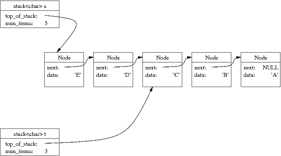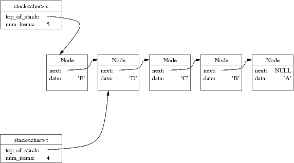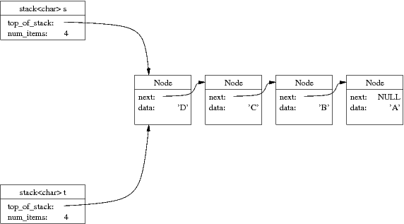 As an example, we gave a linked-list implementation of a stack in an earlier lecture. If we do not explicitly provide non-trivial housekeeping functions, the default copy constructor produces a shallow copy as portrayed in the following figure.
