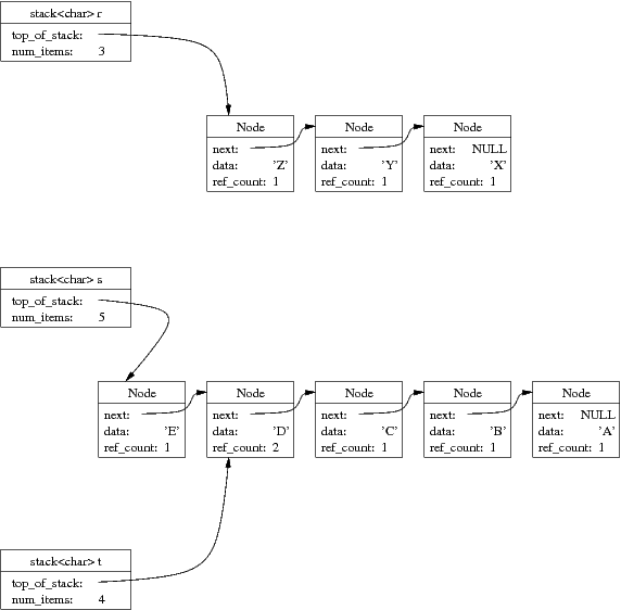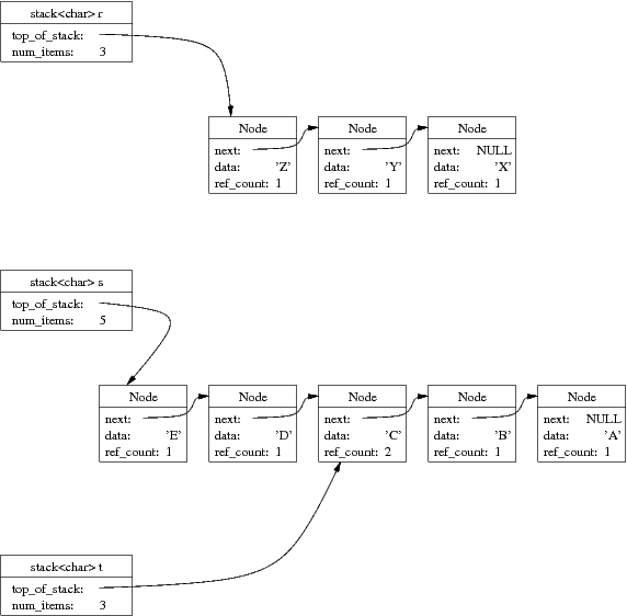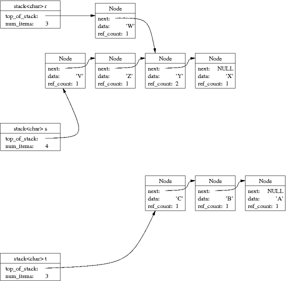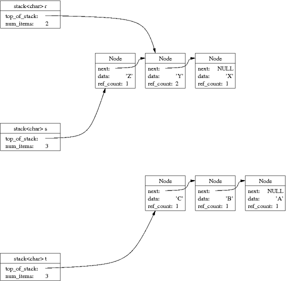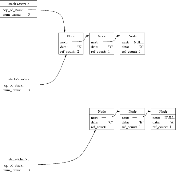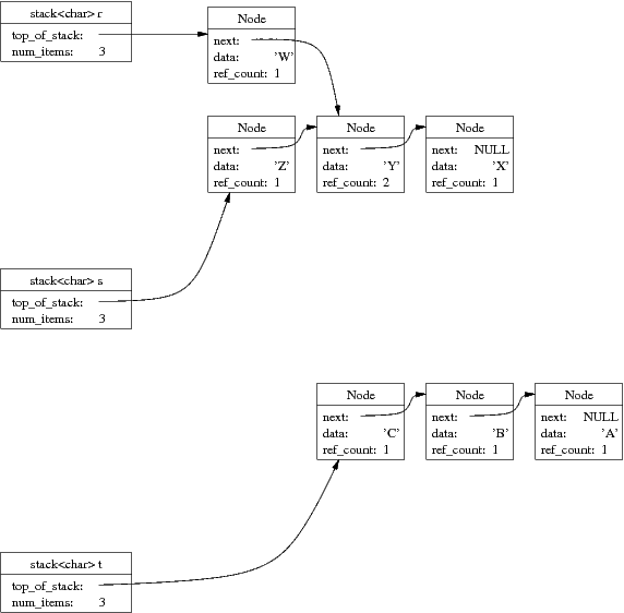 Your goal is to implement a stack class that creates shallow copies for the copy constructor and assignment operator, with the use of reference counting for deleting unused nodes. We will start you off with a working implementation of the stack class that creates deep copies.