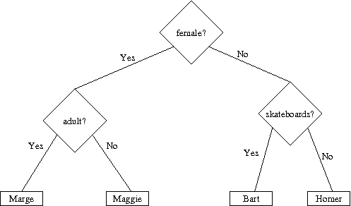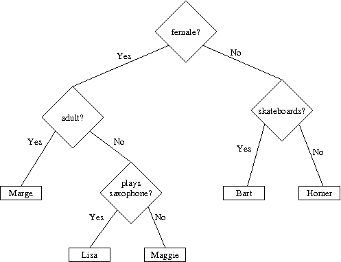 Simpson's characters Q: Is the character female? Q: Is the character an adult? A: Marge Q: Does the character play the saxophone? A: Lisa A: Maggie Q: Does the character ride a skateboard? A: Bart A: Homer