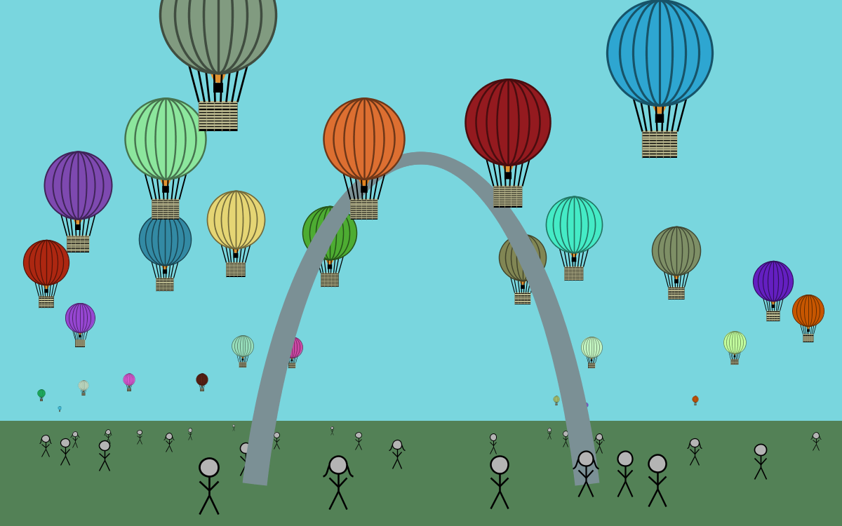 Here is my own interactive example, inspired by the annual balloon glow (even though its actually held in Forest Park, not by the Arch). You may reset the sketch by pressing the 'r' key.