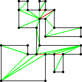 The red lines in the folloiwng diagrams are added during the phase of divising into monotone polygons. The green lines are added when triangulating those monotonoe polygons.